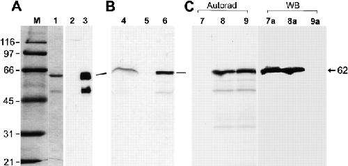 Figure 4. p62 recombinant protein expressed as a 6× histidine tag protein in E. coli was purified using nickel column chromatography. (A) Molecular mass markers (lane M). A 62-kD peptide that corresponded to the size of the ORF of p62 was detected in SDS-PAGE with Coomassie blue staining (lane 1). HCC serum YZ, which was used for cDNA cloning, was reactive with p62 recombinant protein in Western blot analysis (lane 3), but the recombinant protein was not reactive with normal human serum (lane 2) or HCC sera that did not contain detectable antibodies to the 62-kD protein (not shown). A lower molecular size product, presumably a degradation product, detectable by Coomassie blue staining was also reactive with HCC serum (lanes 1 and 3). (B) Immunoprecipitation of in vitro–translated p62 cDNA. Anti-p62 prototype serum (lane 4), normal human serum (lane 5), and in vitro–translated products alone (lane 6). (C) Comigration of the in vitro–translated products of p62 with the 62-kD cellular protein in HepG2 cells. The panel (lanes 7–9) was processed by autoradiography and the same panel (7a–9a) used subsequently for Western blot analysis. Lanes 7/7a contained HepG2 cell extracts alone, lanes 8/8a contained a mixture of in vitro–translated radiolabeled products and HepG2 cell extracts, and lanes 9/9a contained in vitro–translated radiolabeled products alone. The in vitro–translated radiolabeled product of p62 cDNA comigrated exactly with cellular p62.