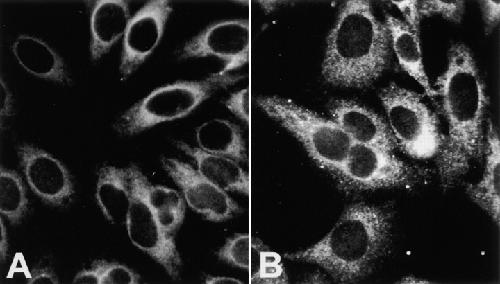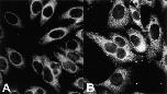Figure 6. p62 is a cytoplasmic protein, as revealed by immunofluorescence analysis of HEp-2 cell substrate using human p62 prototype serum YZ (A) and affinity-purified rabbit anti–p62 serum No. 3366 (B).