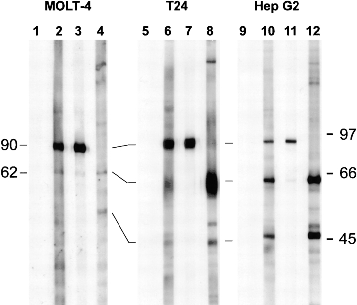 Figure 1. Reactivity of three HCC sera in Western blotting against whole cell extracts from MOLT-4, T24, and HepG2 cell lines. Lanes 1, 5, and 9 were normal human sera. Serum YZ (lanes 2, 6, and 10) showed strong reactivity with a 90-kD protein in MOLT-4 cells and reacted weakly with a 62-kD protein in MOLT-4 cells and T24 cell extracts. A strong reaction with the 62-kD protein was detected with HepG2 cell extracts, together with a strong reaction with a 50-kD protein. Sera YL (lanes 3, 7, and 11) and CH (lanes 4, 8, and 12) demonstrate other types of reactions (see text). These representative data demonstrate that HCC sera are heterogeneous in their antibody repertoires and that different cell lines apparently have different expressions of 90-, 62-, and 50-kD proteins.