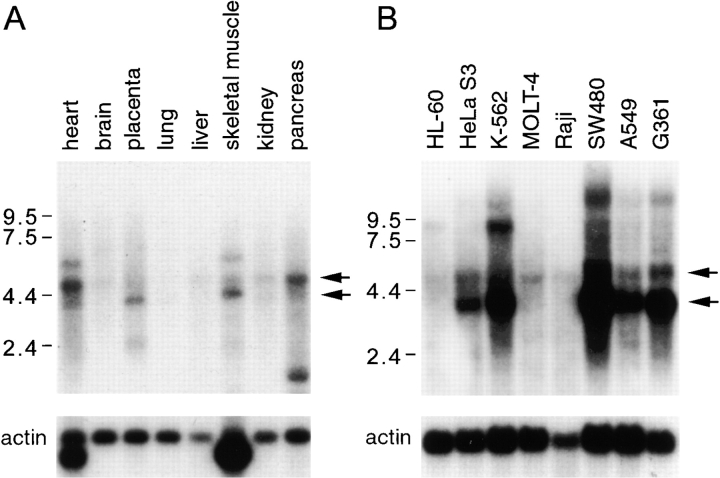 Figure 7. Northern blot analysis of p62 mRNA. The nylon membrane blotted with poly A+ RNA isolated from multiple human tissues (A) and human cancer cell lines (B) was purchased from Clontech. Each lane contained 2 μg of purified poly A+ RNA. An antisense riboprobe was generated from the 480-bp fragments corresponding to the COOH-terminal domain of p62 (see Fig. 2 A) and hybridized to the membrane at a concentration of 1.0 × 106 cpm of the probe per milliliter of hybridization solution. Two transcripts of 3.7 and 5.2 kb were detected in human tissues (A, arrows) and cancer cell lines (B, arrows). The 3.7-kb transcript of p62 was found in heart and placenta, but its occurrence was lower or negative in brain, lung, liver, kidney, and pancreas. A signal for skeletal muscle migrated somewhat more slowly than the 3.7-kb transcript (see text). High levels of the 3.7-kb transcript were detected in HeLa, K-562, SW480, A549, and G361 cell lines, but low expression was observed in HL-60, MOLT-4, and Raji cell lines. The 3.7-kb transcript expression corresponded to detectable cellular p62 protein (see text), but the significance of the 5.2-kb RNA is unknown. A 2.0-kb human β-actin cDNA probe was used as a control for monitoring RNA levels. As described in the manufacturer's (Clontech) instructions, there are two forms of β-actin mRNA, a 2- and 1.6–1.8-kb form, in heart and skeletal muscle.