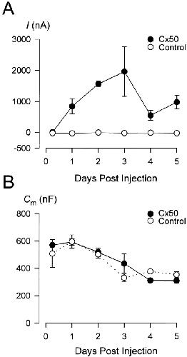 Figure 3. Time course of ICx50 and membrane capacitance (Cm) as a function of Cx50 expression. (A) The magnitude of Ca2+-sensitive currents of control oocytes (○) and ICx50 in oocytes expressing Cx50 (•) 6 h to 5 d after cRNA injection. Vh was −50 mV and the Ca2+-sensitive current was assessed as the difference in the holding current when the [Ca2+]o was changed from 5 mM to 10 μM. (B) Cm of control oocytes (○, dotted line) and oocytes expressing Cx50 (•, solid line) is shown as a function of the time after water or cRNA injection. In both A and B, each data point represents the mean of measurements obtained from three to five different oocytes from the same batch, and the entire protocol was repeated with three different batches of oocytes.