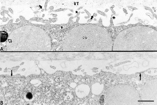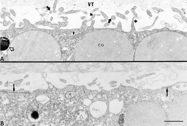 Figure 4. Thin section electron microscopy of cortical regions of a control oocyte and an oocyte expressing Cx50. (A) The vitelline membrane is represented by the gray region on top (VT). The plasma membrane contains folds and microvilli that are sectioned longitudinally (dark arrows) and transversely (curved arrows). The cytoplasm contains endoplasmic reticulum (arrowhead) and large cortical granules (CG). The open arrow points to a pigment granule present in the animal pole of Xenopus laevis oocytes. (B) Shown is the cortical region of an oocyte incubated for 3 d after Cx50 cRNA injection. Expression of Cx50 induced the formation gap junctions, which at this magnification appeared as dark lines (dark arrows and ▵). Gap junctions that were either continuous with the plasma membrane (reflective junctions; dark arrows) or were discontinuous with the plasma membrane (annular junctions) appeared as vesicles in the cytoplasm (▵). Scale bar, 0.67 μm.