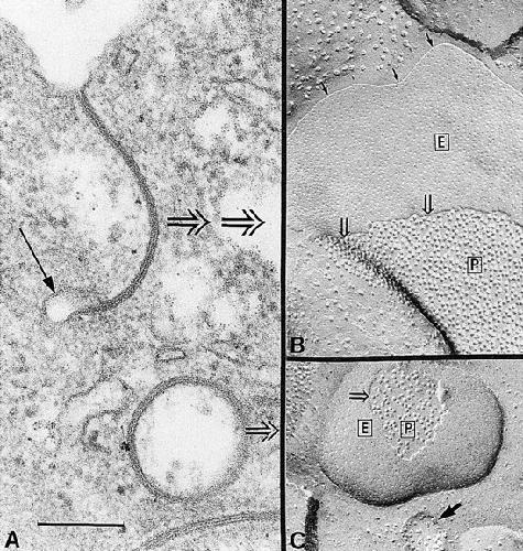 Figure 5. Thin section and freeze-fracture views of reflective and annular gap junctions formed in single oocytes expressing Cx50. (A) The reflective gap junction is formed in an invagination of the plasma membrane. This type of junction often terminates in a small clear vesicle (dark arrow). The annular gap junctions appear as vesicles formed by two closely apposed membranes enclosing a clear lumen. Chevron arrows point to the corresponding freeze-fracture views (in B and C) of the reflective and annular gap junctions. (B) In freeze fracture, the reflective gap junctions appear as plaques of particles (P) and complementary pits (E). The particles and pits forming the plaques are continuous with the fracture face of the nonjunctional plasma membrane, indicating that these arrays are part of the plasma membrane. The top shows a region containing the large (∼13 nm diameter) endogenous particles characteristic of the E face of the plasma membrane of control oocytes. The furrow separating the junctional from the nonjunctional E faces (small dark arrows) is from an endogenous tight junction strand that is occasionally associated with the plasma membrane. Open arrows point to the step separating the E from the P face of the gap junctional plaque. The small height of the step (∼6 nm) strongly indicates that the plaques of particles and pits represent gap junctions and not an arrangement of single hemichannels. (C) Shown are the fracture faces of an annular gap junction. The open arrow points to the fracture step separating the two faces. The dark arrow points to a small diameter vesicle containing hemichannels often found in the cytoplasm of oocytes expressing Cx50. Scale bar, 0.2 μm.