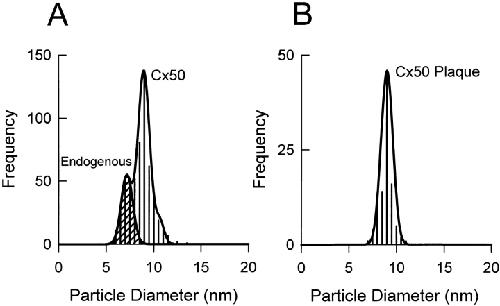 Figure 7. Size (diameter) frequency histograms of single intramembrane particles and those forming the gap junction plaques present in the P fracture face of oocytes expressing Cx50. (A) The histogram was constructed from 554 particle diameter measurements and included both the endogenous particles and the newly inserted hemichannels. The bin size was chosen to be 0.5 nm in size and the data in each bin are plotted at the center of the bin. The data were fitted with a multiple Gaussian function (smooth lines). The hatched region (particle size ∼7 nm) and the larger particles (∼11 nm) represent the endogenous oocyte P face particles (Eskandari et al., 1998). The prominent peak at 9.0 nm corresponds to Cx50 hemichannels. (B) A size frequency histogram constructed from 100 measurements of particles arranged in a gap junction plaque. The size of the particle is 9.0 nm, suggesting that this particle population is identical to the 9.0-nm particle identified in the analysis of single particles from nonplaque regions of the plasma membrane (A).