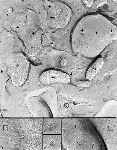 Figure 12. Freeze-fracture electron microscopy of vesicles containing hemichannels located deep in the cytoplasm of an oocyte expressing Cx50. (A) Several large vesicles are shown with the characteristic hemichannels in the P face (P and GJ), and the complementary pits in the E face (E). Some vesicles contain hemichannels at high or low densities and often both types of arrangements are observed in the same vesicle. Vesicles with a high density of particles formed plaques similar to those formed by reflective gap junctions in the plasma membrane (GJ). Vesicles containing low densities of hemichannels exhibited small round plaques (dark arrows), which were often located in a highly curved region of the membrane. The E faces (E) contained the endogenous 13-nm diameter particles intermingled with the complementary pits of hemichannels. G refers to the Golgi stacks. (B) A higher magnification view of a vesicle exhibiting single hemichannels, and hemichannels arranged in rosettes (□) and plaques. C and D show higher magnification views of the small plaques seen in large vesicles with a lower density of Cx50 hemichannels. (E) A higher magnification view of the E face of the vesicle at the bottom of A. The small arrows point to the 13-nm diameter endogenous E face particles and □ encloses a rosette of pits complementary to the small plaques of hemichannels seen in vesicles with a lower density of hemichannels (as in C and D). Scale bars: A, 0.26 μm; B–E, 66 nm.