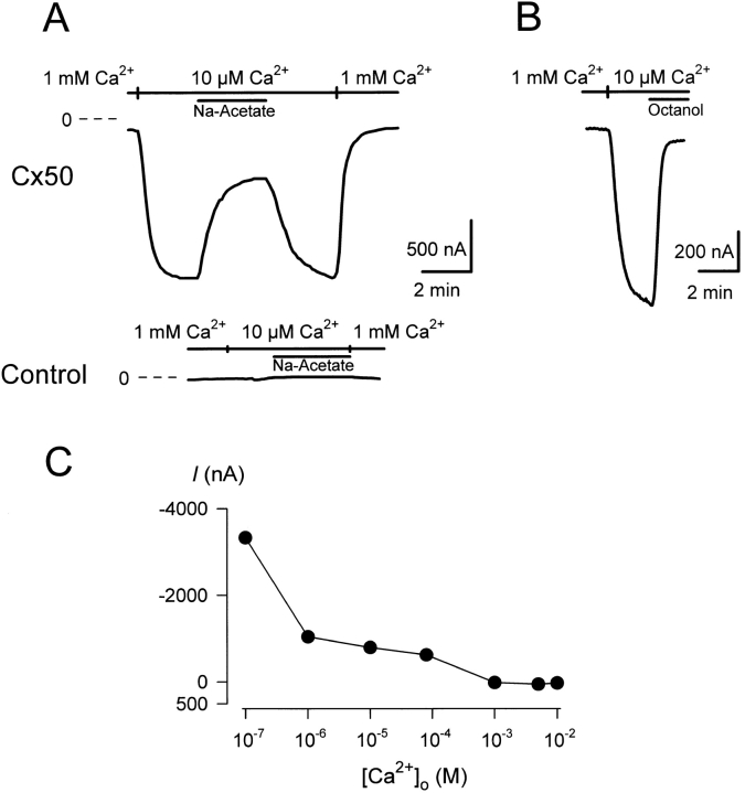 Figure 1. Cx50 hemichannels are sensitive to [Ca2+]o, intracellular pH, and octanol. (A) In a Cx50-expressing oocyte voltage-clamped at −50 mV (top), reduction of [Ca2+]o from 1 mM to 10 μM induced a large inward current (ICx50). Intracellular acidification by the addition of 50 mM Na-acetate to the bathing medium resulted in an ∼65% reversible inhibition of ICx50. In control oocytes (bottom), reduction of [Ca2+]o or intracellular acidification had no appreciable effect on the current. (B) ICx50 was inhibited by addition of 1 mM 1-octanol to the bathing medium. (C) The magnitude of ICx50 depended on [Ca2+]o. Measurements were made 48 h after cRNA injection.