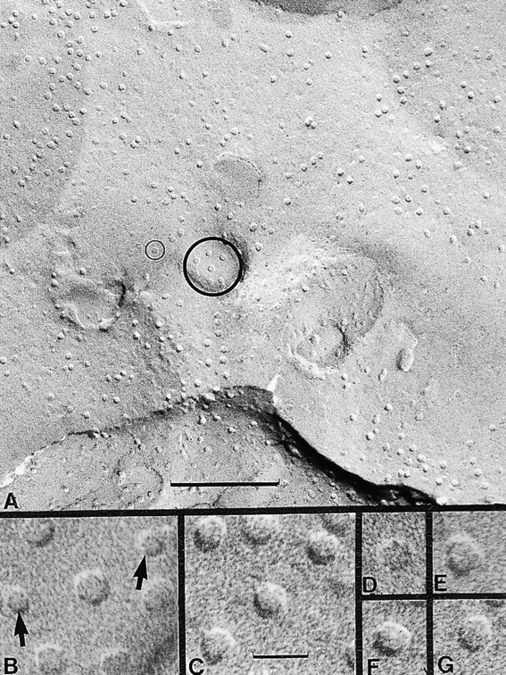 Figure 6. Comparison of the endogenous membrane proteins of the oocyte and the Cx50 hemichannels induced after cRNA injection. (A) A low magnification view of the plasma membrane of an oocyte expressing Cx50 is shown. This region of the plasma membrane was shadowed at a high angle to allow for the analysis of protein size and shape (see Fig. 7). The area enclosed by the large circle is shown in B and the particle in the small circle is shown in D. (B and C) Higher magnification views to show the difference between the smaller endogenous particles (arrows) and the larger Cx50 hemichannels. (D–G) Individual hemichannels were selected from the field in A and shown at high magnification to illustrate their rounded and polygonal overall shape. Scale bars: A, 0.16 μm; B–G, 16.6 nm.