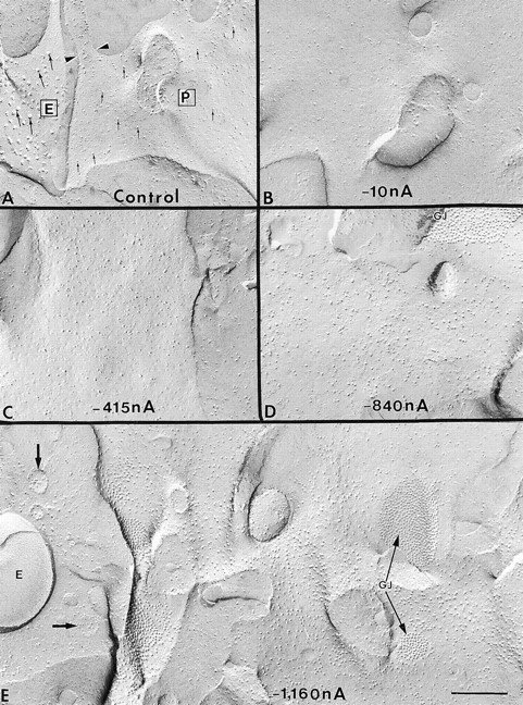 Figure 8. Comparison of the plasma membrane (P face) of a control oocyte with those of oocytes exhibiting different levels of Cx50 expression. (A) The P face (P) of control oocytes contains ∼7-nm diameter particles (small arrows), and the E face (E) is characterized by the presence of 13-nm diameter particles (large arrows). The arrowheads point to the neck connecting a microvillus to the plasma membrane. (B–E) Both ICx50 and the density of hemichannels were measured at various times after the injection of Cx50 cRNA; 6 h (B), 24 h (C), 48 h (D), and 72 h (E) (see also Table II). Expression of Cx50 increases the density of hemichannels only in the P face of the plasma membrane. The density of hemichannels is correlated with the magnitude of ICx50. The first indication of reflective gap junctions (GJ) was found 48 h after cRNA injection (D). Peak values for both ICx50 and the particle density were seen at 72 h (E). In E, the upper left corner shows the convex surface (E) of an annular gap junction and the concave surface of the small vesicles (arrows) containing the characteristic Cx50 hemichannels. Scale bar, 0.2 μm.