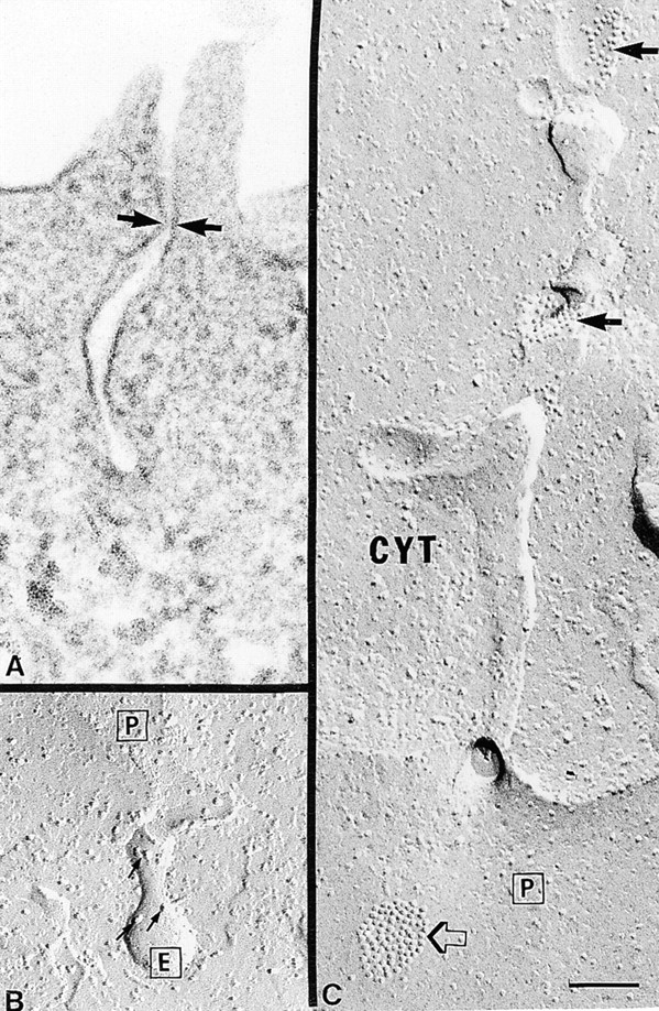 Figure 11. Thin section and freeze-fracture electron microscopy of invaginations of the plasma membrane containing Cx50 hemichannels. (A) Thin section of an infolding (∼0.3 μm in length) of the plasma membrane that ended in a small rounded vesicle. Regions of close membrane apposition often occurred near the plasma membrane (arrows). Similar structures were also observed in control oocytes. (B) Freeze-fracture view of an invagination of the plasma membrane that also ended in a round vesicle of ∼100 nm in diameter. The convex E face (E) of the vesicle exhibited pits complementary to the Cx50 hemichannels, and also contained the endogenous 13-nm diameter particles (small dark arrows). (C) Freeze-fracture view of a long tubular invagination continuous with the plasma membrane. The plasma membrane P face (P) contained single as well as plaques of Cx50 hemichannels (open arrow). Similarly, the invagination contained both single hemichannels and hemichannels in plaques (dark arrows). CYT, cytoplasm. Scale bar, 0.1 μm.
