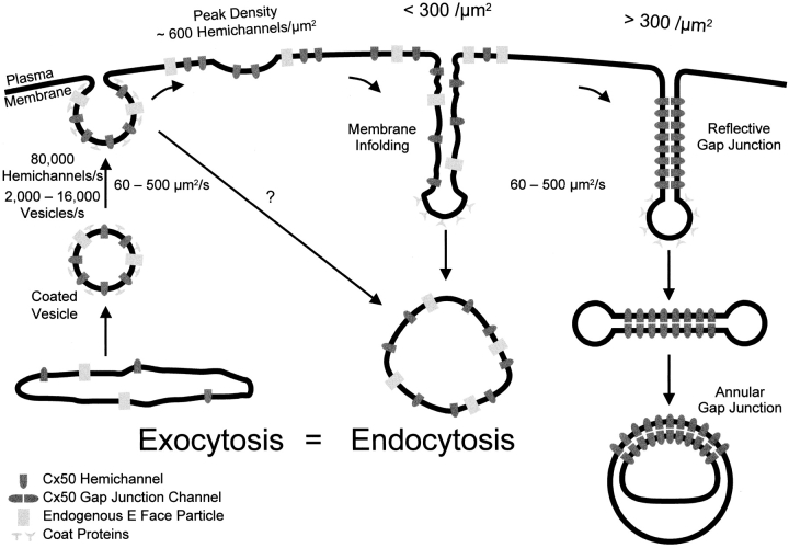 Figure 14. A model proposing that the trafficking of Cx50 hemichannels to and from the plasma membrane of oocytes occurs along the constitutive (default) pathway. We propose that Cx50 is inserted into the plasma membrane as a hemichannel (connexin hexamer). Insertion into the plasma membrane occurs at an initial rate of 80,000 hemichannels/s. Hemichannel insertion is via exocytosis of small coated vesicles at a rate of 2,000–16,000 vesicles/s, corresponding to the addition of 63–503 μm2/s of membrane to the plasma membrane. Retrieval occurs through the formation of membrane invaginations that eventually pinch off and form large vesicles in the cytoplasm. At a hemichannel density <300/μm2, the Cx50 hemichannels are retrieved, intermingled with some endogenous plasma membrane proteins, in the same large vesicles. At a density >300 hemichannels/μm2, the large vesicles form reflective gap junctions that pinch off and appear as annular gap junctions in the cytoplasm. The principal characteristic of this pathway is that the area of the plasma membrane does not change during hemichannel insertion, indicating that plasma membrane endocytosis balances the rate of vesicle insertion.