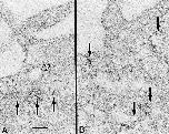 Figure 13. Thin sections of the cortical regions of oocytes incubated in the presence of the enzyme peroxidase. (A) The peroxidase enzymatic products are shown in the lumen (dark arrows) of three vesicles. The open arrow points to a smaller coated vesicle without the marker. B shows several irregularly shaped vesicles (arrows) containing peroxidase reaction products in their lumens. The intraluminal localization of the extracellular marker suggests that these vesicles are derived from the plasma membrane of the oocyte by endocytosis. Scale bar, 0.1 μm.