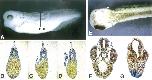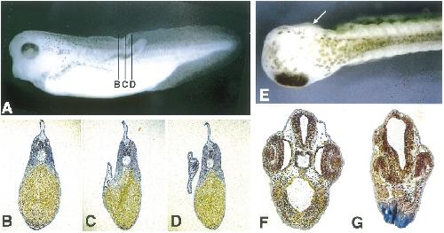Fig. 6. Overexpression of XER81 induces the formation of tail-like protrusions and inhibits eye development in Xenopus embryos. (A) Tadpole stage Xenopus embryo that had been injected with XER81 encoding mRNA into two ventral blastomeres at the four cell stage and exhibits formation of a tail-like protrusion. (B,D) A series of transverse sections from a region of the tadpole indicated in panel (A). Sections were stained with aniline blue and orange G, allowing distinction of neural mesodermal and endodermal cells. (E) Tadpole stage Xenopus embryo that had been injected with XER81 encoding mRNA into two dorsal blastomeres at the four cell stage and exhibits inhibition of eye development. (F,G) Transverse sections at the level of the eye with a control embryo (F) and an embryo that had been injected with XER81 encoding mRNA into both blastomeres at the two cell stage (G). |