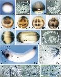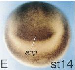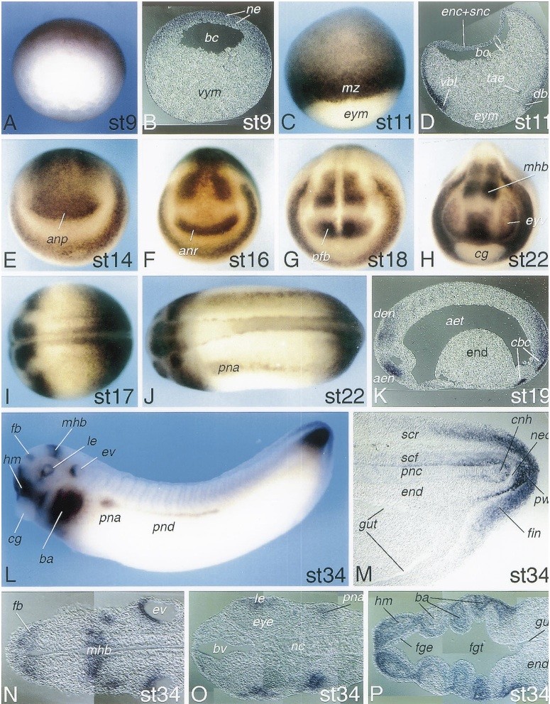 Fig. 3. Whole mount in situ hybridization analysis of XER81 expression during Xenopus embryogenesis. Staged Xenopus embryos were subjected to whole mount in situ hybridization with XER81 antisense RNA. (A) Blastula (stage 9) embryo (top, animal pole; bottom, vegetal pole). (B) Transverse section of the embryo shown in (A). (C) Gastrula (stage 11) embryo (top-animal hemisphere). (D) Transverse section of the embryo shown in (C). (E,H) Anterior view of staged embryos (stages are indicated). (I,J) Dorsal view of a neurula (stage 17) and a stage 22 embryo; abbreviation: pna, pronephros anlage. (K) Parasagital section of a neural tube stage embryo. (L) Analysis of XER81 expression in a tadpole (stage 34) embryo. (M) is a posterior detail from a sagital section, (N) gives anterior details from a dorsal to ventral series of horizontal sections. Abbreviations: aen, archencephalon; aet, archenteron; anp, anterior neural plate; anr, anterior neural ridge; ba, branchial arches; bc, blastocoel; bv, brain ventricle; cbc, circumblastoporal collar; cg, cement gland; cnh, chorda-neural hinge; dbl, dorsal blastopore lip; den, deuteroencephalon; enc, epithelial layer of neuroectoderm; end, endoderm; ev, ear vesicle; eym, endodermal yolk mass; eyv, eye vesicle; fb, forebrain; fge, foregut epithelium; hm, head mesenchyme; le, lens; mhb, midbrain/hindbrain boundary; mz, marginal zone; nc, notochord; ne, neuroectoderm; nec, neuroenteric canal; pfb, prospective forebrain; pna, pronephvic anlage; pnc, posterior notochord; pnd, pronephric duct; pw, posterior wall; scf, spinal cord floor; scr, spinal cord roof; snc, sensorial layer of neuroectoderm; tae, tip of archenteron; vbl, ventral blastopore lip; vym, vegetal yolk mass. |