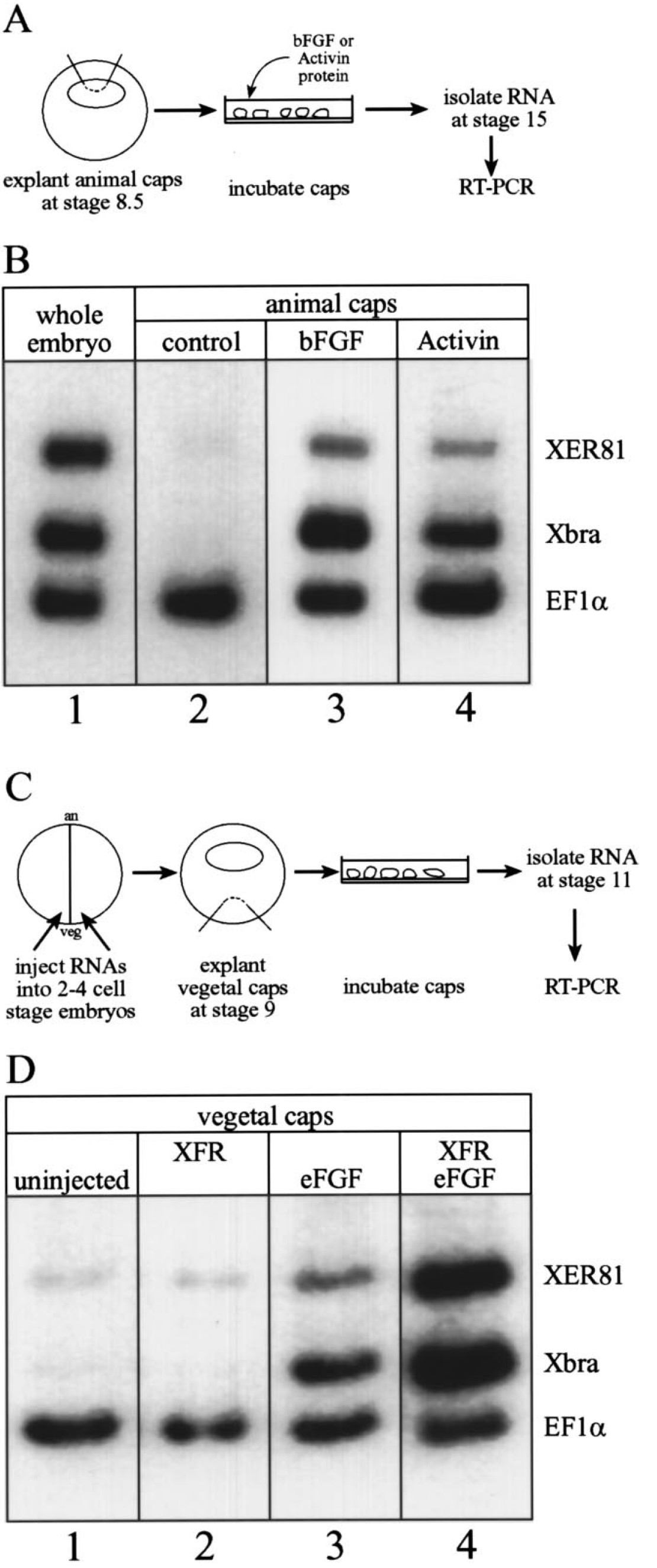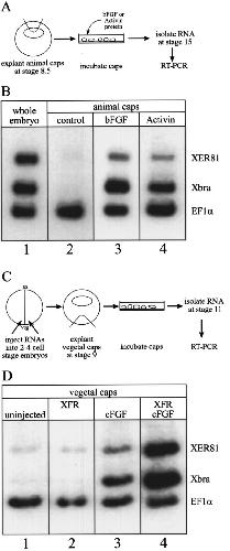 Fig. 5. XER81 is inducible by FGF in animal and vegetal caps. (A) Experimental design of the animal cap experiment. Animal caps were dissected at stage 8.5 and cultured in the presence of bFGF or activin until stage 15. (B) bFGF clearly induced XER81 expression (B, lane 3) whereas induction by activin was weaker in animal cap explants (B, lane 4). (C) Experimental design of the vegetal cap experiment. 10 pg of eFGF or 100 pg of XFR (wild type FGF receptor) were injected into two vegetal blastomeres at the 2-cell stage. Vegetal caps were dissected at stage 9 and cultured until stage 11. (D) eFGF induced the XER81 expression in vegetal cap explants (D, lane 3). This effect was enhanced by coexpression of the full length FGF receptor and eFGF (D, lane 4). RNA of animal and vegetal explants was isolated and RT-PCR was performed to analyze the expression of XER81, Xbra as a marker and EF-1a as a loading control. Equivalents of 1/17 whole embryos, 0.2 animal caps or 0.5 vegetal caps were used in each PCR reaction.