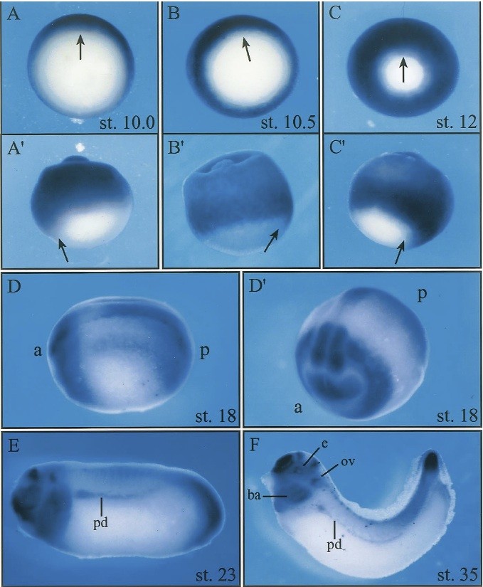 Fig. 3. Spatial expression of XER81 during normal development. Embryos were hybridized with a digoxigenin-labeled XER81 antisense RNA probe. (A) show different gastrula stages in a vegetal view, (Aʹâ²Ê¹â²) in a lateral view. Arrows indicate the dorsal blastopore lip. (D) and (Dʹâ²) show a neurulaembryo in a lateral and anterior view, a: anterior, p: posterior. In (E) and (F) a distinct pattern is visible in the eyes (e), ear vesicles (ev), brain, branchial arches (ba), tailtip and the pronephric duct (pd).