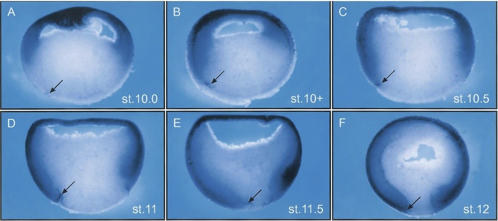 Fig. 4. Spatial expression of XER81 during gastrula stages. Vibratome sections (100 mm thick) were hybridized with a digoxigenin-labeled XER81 antisense RNA probe. With the onset of gastrulation (A) XER81 mRNA is predominantly found in the animal cap. At stage 10 + expression appears in the dorsal marginal zone (B), at stage 10.5 in the ventral marginal zone (C). XER81 expression increases ventrally until it is equally strong in the total marginal zone at stage 11 (D). As gastrulation proceeds, expression of XER81 decreases in the animal cap and increases in the marginal zone (E, F). Arrows denote the dorsal blastopore lip.