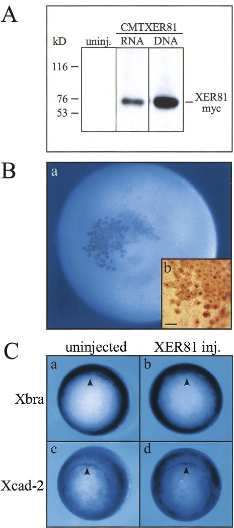Fig. 7. Expression of XER81myc in Xenopus embryos. (A) Embryos were injected with either 600 pg of CMTXER81 DNA or 2 ng of XER81myc mRNA and proteins were isolated at stage 10.5. SDS-PAGE was performed with one embryo equivalent from DNA injected or two equivalents from mRNA injected or not injected control embryos. Western blotting was done with the anti-myc antibody 9E10. XER81myc protein of the expected size of 71 kDa was detected. (B) Albino embryos were injected with 500 pg of XER81myc mRNA and whole-mount immunostaining was performed with the anti-myc antibody at stage 10.5. XER81myc protein was detected at the site of injection (B, a). Higher magnification of cleared embryos revealed a strong XER81 signal in the nuclei and weaker staining in the cytoplasm (B, b). (C) Embryos were injected with 2 ng of XER81 mRNA and whole-mount in situ hybridization was performed at stage 10.5 with antisense mRNA probes for Xbra and Xcad-2. Overexpression of XER81 did not change the expression pattern of Xbra (b) and Xcad-2 (d) compared to uninjected control embryos (a, c). Bar in B corresponds to 25 mm.