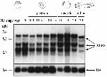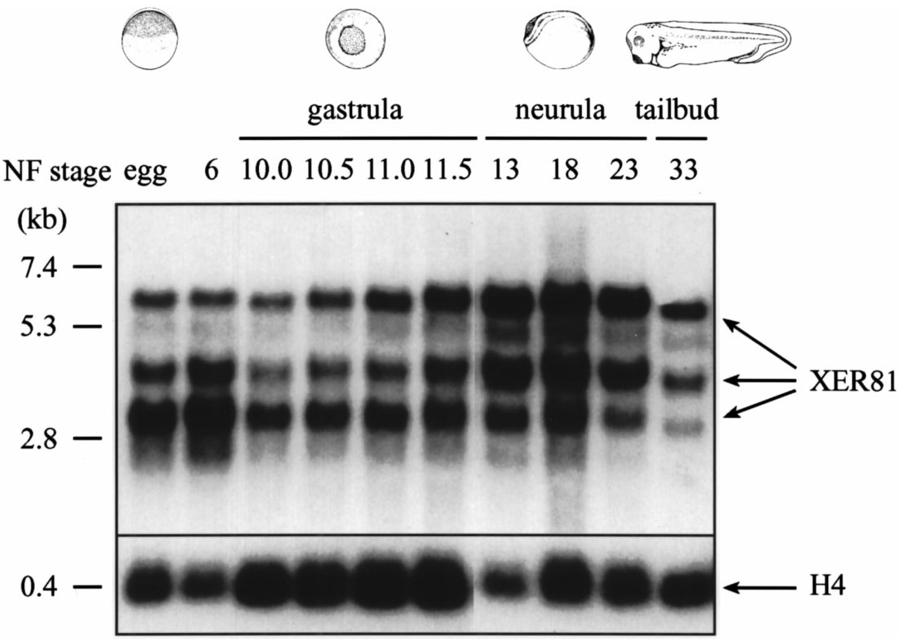Three XER81-specific transcripts of 3, 4 and 6 kb are detectable. The 3 kb transcript is strongest in pre-MBT stages (egg and stage 6). Expression of the 4 and