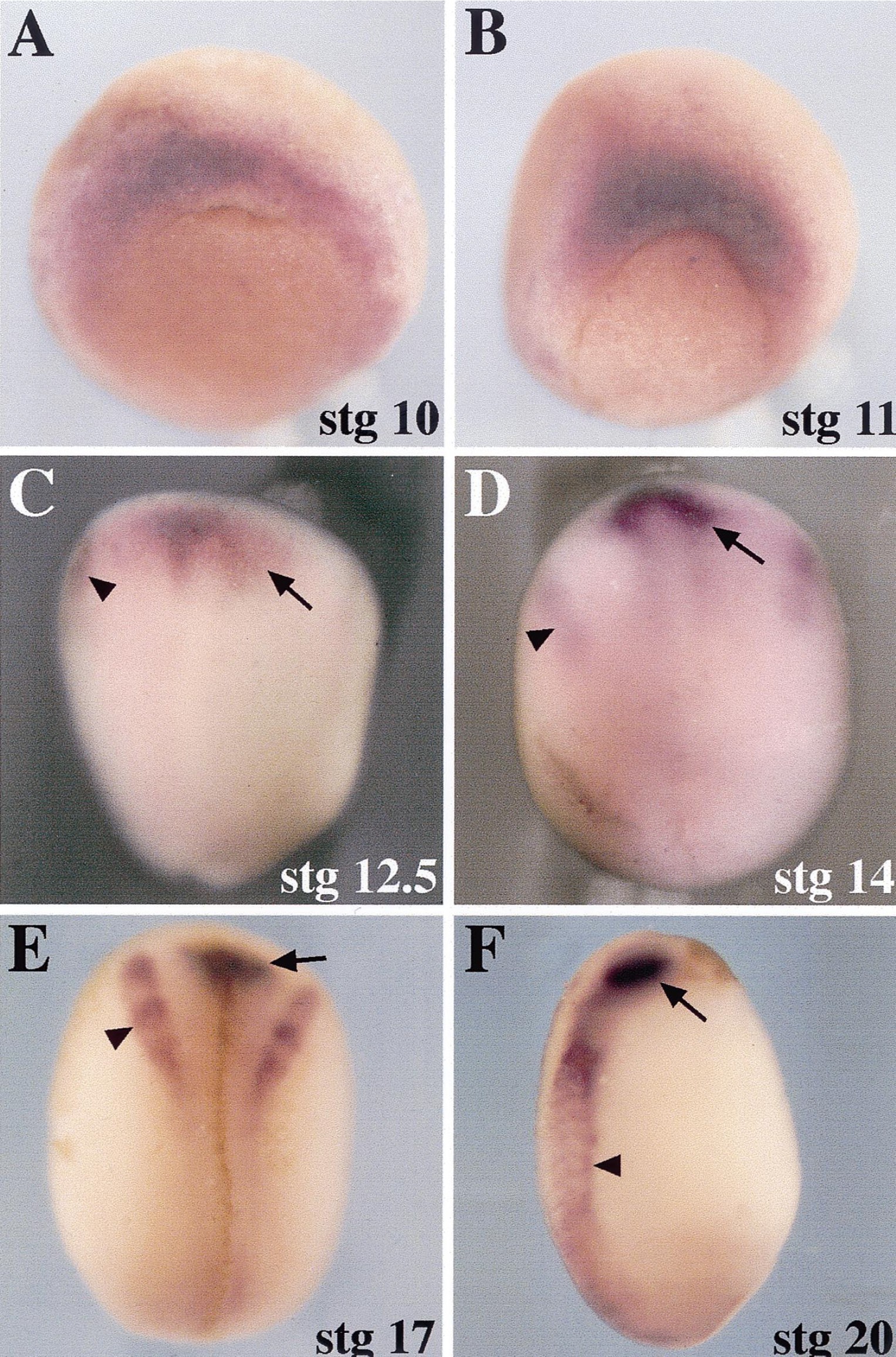 Fig. 2. Expression pattern of Xbf2 in Xenopus embryos at different developmental stages. (A) Dorsal views, anterior is up; (F) lateral view, anterior is up. (A) At stage 10 Xbf2 is initially detected in the dorso-lateral prospective mesoderm. (B) Stage 11 embryo showing Xbf2 expression in the uninvoluted dorsolateral prospective mesoderm. (C) Stage 12.5; at this stage expression appears in the anterior neural plate (arrow) and in the anterior neural folds (arrowhead). (D,E) At stages 14 and 17, respectively, Xbf2 expression becomes stronger in the anterior neural plate (arrows) and in the anterior neural folds (arrowheads). At stage 17, Xbf2 is clearly expressed in the segmented premigratory cephalic neural crest (arrowhead). (F) Stage 20 embryo showing Xbf2 expression in the eye (arrow) and in the paraxial mesoderm (arrowhead). Note that at this stage the expression in the migratory neural crest has disappeared.