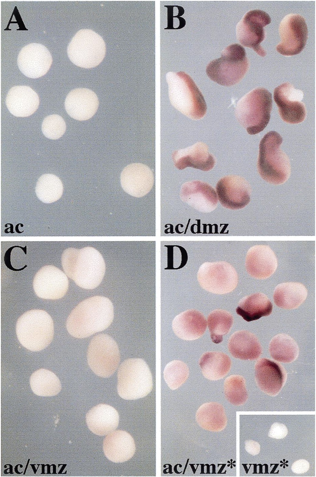 Fig. 4. Xbf2 affects the neural inducer capacity of the mesoderm. Different tissues were dissected from control or Xbf2 injected stage 10 embryos, conjugated and cultured until the equivalent of stage 17, when Xsox2 expression was analyzed. (A) Control animal caps showed no Xsox2 expression (n = 15). (B) All the conjugates of animal cap and dorsal marginal zone strongly expressed Xsox2 (n = 14). (C) Animal caps conjugated with ventral marginal zone did not express Xsox2 (n = 17). (D) Most of the conjugates of animal cap and ventral marginal zone taken from embryos injected with 4 ng of Xbf2 mRNA expressed Xsox2 (70%, n = 13), although at lower levels than conjugates of animal cap and dorsal marginal zone. In contrast, the ventral marginal zone alone taken from injected embryos did not express Xsox2 (inset; n = 10).