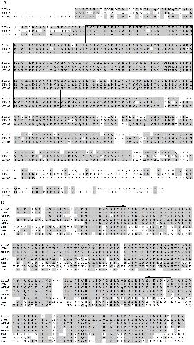amino acids are shaded and gaps are represented as dashes. The amino acid sequences corresponding to the degenerate primers are indicated by
