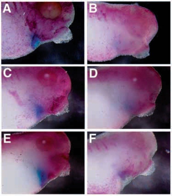 with lacZ alone (A,C,E) or with lacZ + XTbx5-EnR-GR (B,D,F).