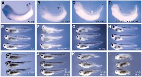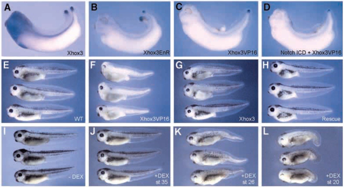 dexamethasone at stage 35. (K) Embryos injected with 400 pg Xhox3VP16GR and treated with dexamethasone at stage 26 have reduced tails and