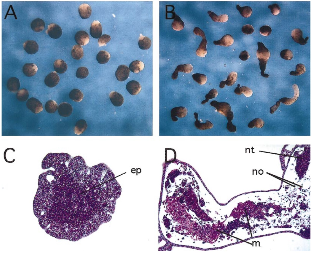 explants were treated with 200 ng/ml of recombinant human BMP-11 and cultured to neurula stage for morphology (A, B) and tadpole stage