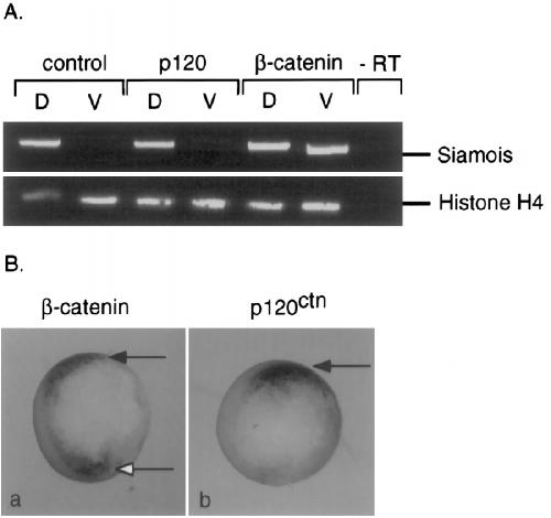 FIG. 3. p120ctn does not induce expression of Siamois or goosecoid. (A) Detection of Siamois expression in dorsal and ventral halves of stage