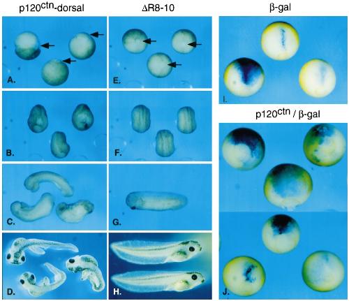 of p120ctn (B, D, F, H, J, L) or DR8-10 (A, C, E, G, I, K) mRNA into one dorsal blastomere at the four-cell stage. Embryos were permitted to