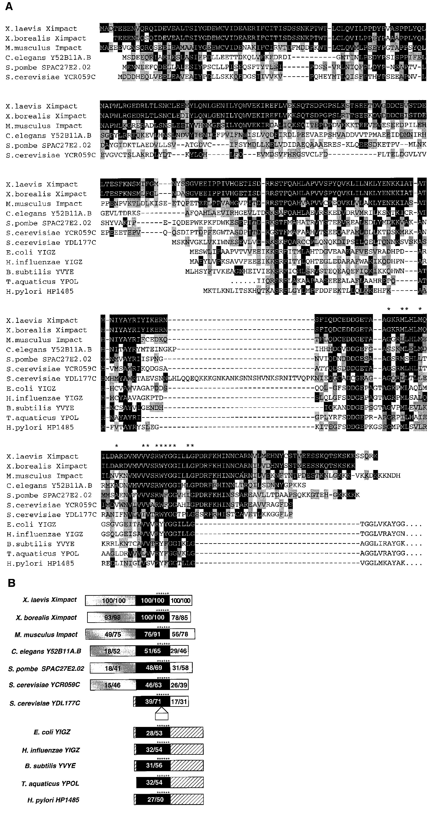FIG. 2. Alignment of the Ximpact homologs. (A) Comparison of deduced amino acid sequences between Ximpact and other homologs.