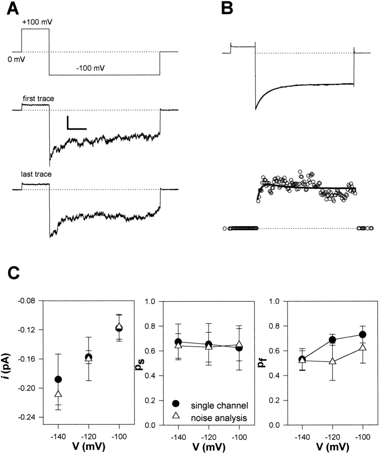Figure 5. Determination of single channel parameters using macroscopic fluctuation analysis. (A) The voltage protocol (top) was applied repeatedly (at least 100 times). Representative individual registrations are shown below (pHi 6.5; scale bars: 0.1 s and 4 pA). (B) Mean current response for the step to −100 mV (top) and corresponding variance (see methods; scale bar: 0.3 pA2). Thick solid lines represent kinetic fits assuming independent single-exponential gating relaxations for the two gates as described in methods. For clarity, averages of 10 data points are shown as circles for the experimental variance. For the fit, no averaging was performed. (C) Comparison of mean values for the single channel current, i, and the stationary open probabilities, Ps and Pf, obtained by the fluctuation analysis (▵: −140 mV, n = 8; −120 mV, n = 11; −100 mV, n = 9) with the values obtained from the amplitude histograms of single-channel recordings (•: −140 mV, n = 4; −120 mV, n = 7; −100 mV, n = 4).