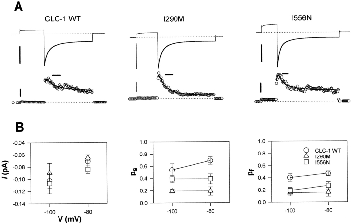 Figure 6. Fluctuation analysis for WT ClC-1 and the myotonic mutations I290M and I556N. (A) Representative fluctuation analysis for the three channel types. Mean current (top) and variance (bottom) are shown together with the kinetic fits (thick lines; see Fig. 5). (Registrations are at −100 mV, pHi 7.3; horizontal scale bars, 50 ms; vertical scale bars, 200 pA [top] and 5 pA2 [bottom].) (B) Comparison of single channel parameters obtained for WT ClC-1 and mutants I290M and I556N at pHi 7.3.