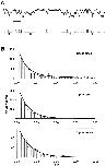 Figure 4. Kinetic analysis of a particularly clean recording. (A) Short segment of the original registration filtered at 200 Hz (top) and the corresponding idealized trace (bottom; scale bars: 0.3 pA and 0.1 s). (B) Dwell time histograms for the three conductance levels (boxes). The dashed line in the top panel is a single exponential fit to the closed-time histogram. Solid lines represent a combined fit of the model shown in Fig. 3 B to the histograms using the maximum-likelihood criterion. Values for the rate constants obtained from the fit are (s−1): α, 34; β, 22; λ, 13; μ, 6. From these, the stationary probabilities Pf = α/(α + β) = 0.59 and Ps = λ/(λ + μ) = 0.68, and the relaxation times τf = 1/ (α + β) = 17 ms and τs = 1/(λ + μ) = 51 ms can be calculated with a ratio τs/τf < 3. The stationary probabilities obtained from the amplitude histogram of the same patch are Pf = 0.48, Ps = 0.74.