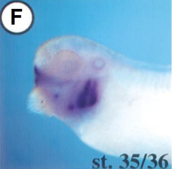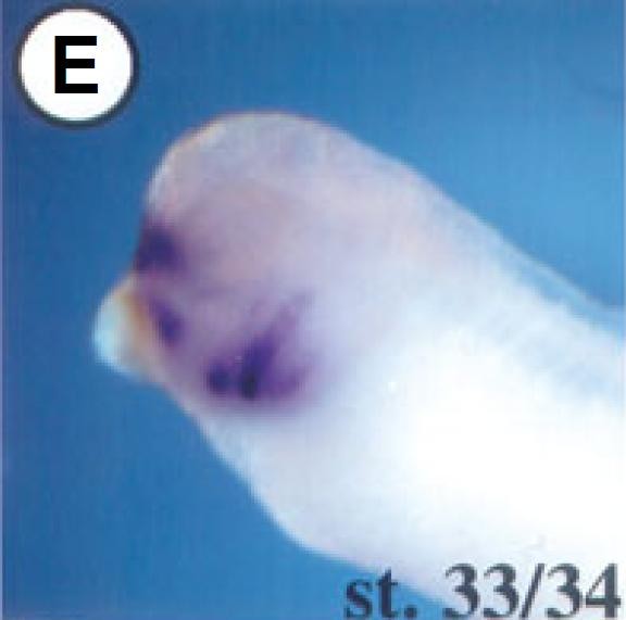 FoxE1 ( forkhead box E1 (thyroid transcription factor 2) ) gene expression in Xenopus laevis embryos, NF stage 33, as assayed by in situ hybridization, lateral view, anteriorleft, dorsal up.