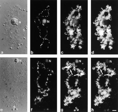 Figure 2. xlADAR1 localizes to the nascent RNP matrix and is specifically enriched on a special loop on bivalent no. 3. LBCs were prepared from oocytes expressing myc-tagged ADAR1.1. (a–d) Normal LBC and (e–f) bivalent no. 3. (a and e) DIC image, (b and f) DAPI staining, (c and g) localization of endogenous ADAR1 detected with SAT4 antiserum in the rhodamine channel and (d and h) localization of myc-tagged ADAR1.1 detected with mAb 9E10 in the fluorescein channel. Endogenous and ectopically expressed ADAR1 is localized to LBC loops. (g and h) A special loop on bivalent no. 3 is enriched for endogenous (g) and ectopically expressed ADAR1 (h). The special loop is marked by arrows. Faint background signals can be seen on nucleoli (N) or snurposomes (S) by staining with SAT4 antiserum that is not seen with myc-tagged ADAR1.1. Bar, 10 μm.