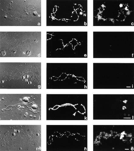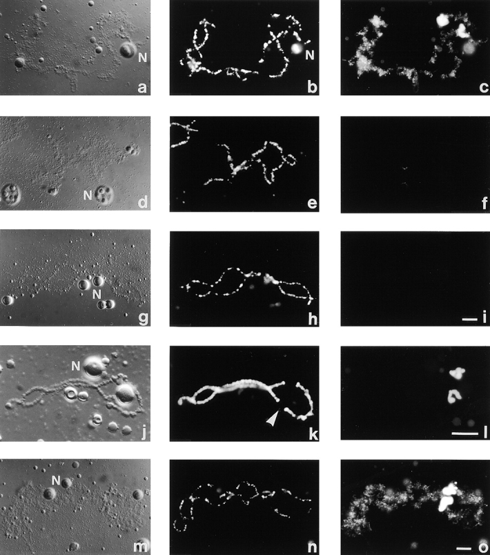 Figure 3. Localization of ADAR1 to LBC loops is RNA dependent. Staining of bivalent no. 3 with SAT4 antiserum. (a, d, g, j, and m) DIC image, (b, e, h, k, and n) DAPI staining, and (c, f, i, l, and o) staining with Sat4 in the fluorescein channel. (a–c) ADAR1 is localized to LBC loops and is specifically enriched on a special loop. (d–f) Staining with Sat4 can be blocked by ADAR1 peptide. (f) SAT signal is almost completely diminished when the antiserum was blocked with ADAR1 peptide originally used for the immunization. (g–i) SAT staining is sensitive to RNAse treatment. LBCs were digested with RNAse before staining with Sat4 antiserum. (g) The loops appear “stripped” after RNAse treatment, and (i) no signal can be observed in the fluorescein channel. (j–l) Treatment with actinomycin D inhibits transcription and diminishes staining of regular loops but not of the special loop on bivalent no. 3. (j) DIC image of bivalent no. 3 prepared from an oocyte after incubation in AMD. The chromosomal axes is condensed and shows no transcriptionally active loops. Also nucleoli (N) change their morphology. (k) The condensed, shortened chromosomal axes is well stained with DAPI. The position of the special loop forming a “double loop bridge” is seen by the interrupted DAPI staining of the chromosomal axes on both homologues (arrowhead). (l) As transcription is inhibited no ADAR1 staining can be observed. Only the special loop is still brilliantly labeled by SAT4 antiserum. (m–o) Injection of an unrelated oligonucleotide temporarily inhibits transcription but does not affect ADAR1 localization on the special loop on bivalent no. 3. (m) DIC image of bivalent no. 3 prepared from an oocyte 24 h after injection of an oligonucleotide. The presence of loops on the chromosome indicates that transcription has already resumed. (n) DAPI image of the same region. (o) ADAR1 can be detected on most transcripts and on the special loop by staining with SAT4 antiserum. Note: Shortly after injection of the oligo transcription seizes and no ADAR1 staining can be detected on regular loops (not shown). However, staining of the brilliantly labeling loop is not affected by this treatment. Bars, 10 μm.
