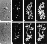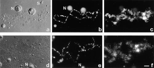 Figure 5. Splicing is not required for ADAR1 localization. (a and d) DIC images, (b and e) DAPI staining, and (c and f) ADAR1 localization detected by staining with SAT4 antiserum in the fluorescein channel. (a–c) Staining of bivalent no. 3 from an untreated oocyte shows localization of ADAR1 on the RNP matrix of regular loops and on the special loop. (d–f) 24 h after injection of the U2b oligo transcription has resumed giving rise to prominent loops (d). (f) Staining with SAT4 antiserum shows the presence of ADAR1 on the loop matrix and on the special loop on bivalent no. 3. Bar, 10 μm.