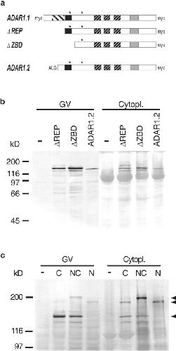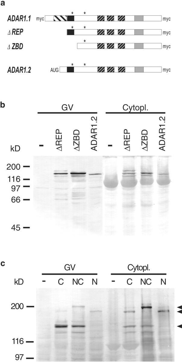 Figure 7. (a) Schematic representation of deletion constructs used in this study. The peptide repeats (left striped box), the ZBD (black box), the dsRBDs (right striped box) and the deamination domain (gray box) are indicated. ΔREP deletes the NH2-terminal peptide repeats from ADAR1.1 leaving a single, COOH-terminal myc tag. ΔZBD deletes a longer portion from the NH2 terminus of ADAR1.1 including the putative Z-DNA binding domain and one of two putative NLSs. ADAR1.2 does not contain the peptide repeats and is only myc-tagged at its COOH terminus. An artificial AUG codon was introduced at the beginning of the cDNA. (b) Western blot of oocyte nuclei (GV) and cytoplasms (Cytopl.) of uninjected oocytes (−) and of oocytes expressing myc-tagged ADAR1 versions. All myc-tagged ADAR1 versions express well and accumulate in the nucleus. Cytoplasmic signals are seen 24 h after injection but diminish over time as the protein is transported to the nucleus. (c) ADAR1 undergoes NH2-terminal proteolytic cleavage. Western blot of oocyte nuclei (GV) and cytoplasms (Cytopl.) of uninjected (−) or injected oocytes expressing ADAR1.1 myc tagged at its COOH terminus (C), COOH and NH2 terminus (NC) or NH2 terminus only (N). In the cytoplasm full-length versions (180 to 190 kD) of all three constructs can be easily detected (upper two arrowheads). A smaller (150 kD) breakdown product can only be detected for the two versions carrying a COOH-terminal myc-tag (lower arrowhead). In the nucleus (GV) the breakdown product is the most prominent form found 24 h after injection. However, also the full-length versions can be detected in the nucleus. If the myc-tag is only present at the NH2 terminus (N) only full-length protein can be detected, indicating that the NH2 terminus undergoes proteolytic cleavage.