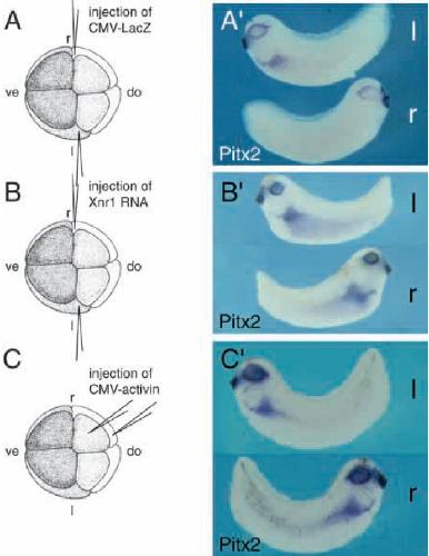 Left-right asymmetry in vertebrates is controlled by activities emanating from the left lateral plate. How these signals get transmitted to the forming organs is not known. A candidate mediator in mouse, frog and zebrafish embryos is the homeobox gene Pitx2. It is asymmetrically expressed in the left lateral plate mesoderm, tubular heart and early gut tube. Localized Pitx2 expression continues when these organs undergo asymmetric looping morphogenesis. Ectopic expression of Xnr1 in the right lateral plate induces Pitx2 transcription in Xenopus. Misexpression of Pitx2 affects situs and morphology of organs. These experiments suggest a role for Pitx2 in promoting looping of the linear heart and gut.