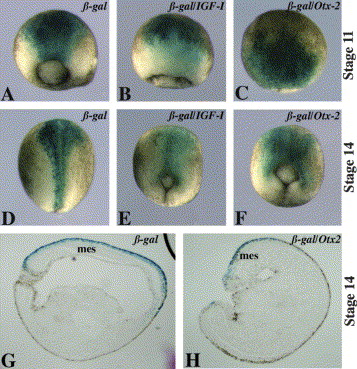 Fig. 3. Cell lineage tracing of convergent extension movements during gastrulation in dorsally-injected embryos with IGF-I or Otx2 mRNA. (A) An embryo at stage 11 injected with Lac Z mRNA alone shows convergent extension of Ã-gal-stained cells. (B) An IGF-I-injected embryo at the same stage shows delayed gastrulation and uniform distribution of Ã-gal-stained cells in the dorsal region. (C) An Otx2-injected embryo with similar phenotype. (D) In an early neurula injected with Lac Z mRNA alone, Ã-gal-stained cells are distributed in the narrowed trunk and posterior neural plate, indicating convergent extension movements. (E,F) Early neurula injected with IGF-I (E) or Otx2 (F) mRNA show open blastopore and uniform staining of Ã-gal in the neural plate. (G) Longitudinal section of a stage 15 control embryo showing the elongation of neuroectoderm and mesoderm (mes). (H) Longitudinal section of an Otx2-injected stage 15 embryo with a reduced elongation of neuroectoderm and underlying mesoderm (mes).