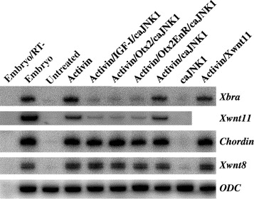 Fig. 7. Xwnt11 and caJNK1 do not modify gene expression in activin-treated explants expressing IGF-I, Otx2 or Otx2-EnR. Embryos at 4-cell stage were injected with indicated mRNA at the animal pole region and ectodermal explants were dissected at stage 8. They were treated with activin and cultured to stage 10.5 for RT-PCR analysis. Notice that caJNK1 does not induce the expression of mesoderm markers, and that expression of Xbra, Xwnt11, chordin and Xwnt8 was not modified by caJNK1 and Xwnt11 in activin-treated explants expressing IGF-I, Otx2 or Otx2-EnR.