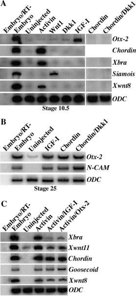 Fig. 1. Induction of Otx2 expression in ectodermal explants by IGF-I. (A) IGF pathway specifically activates Otx2 transcription. Synthetic mRNAs corresponding to Wnt-1, Dkk-1, chordin and IGF-I were injected near the animal pole region at 2-cell stage. Ectodermal explants from uninjected and injected embryos were dissected at blastula stage, explants from uninjected embryos were also treated with activin. RT-PCR was performed at early gastrula stage. Strong Otx2 expression was detected in explants expressing IGF-I, while activin, Wnt-1, chordin and Dkk-1 or a combination of chordin and Dkk1 had no effect on Otx2 expression. (B) Explants expressing indicated mRNA cultured to stage 25 express neural markers like Otx2 and N-CAM. (C) Specific inhibition of Xbra and Xwnt11 expression by IGF-I and Otx2 in activin-treated explants. IGF-I and Otx2 had no effect on the expression of chordin, goosecoid and Xwnt8 induced by activin