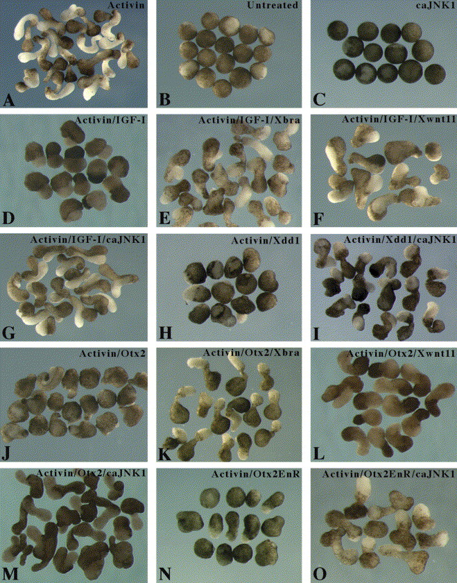 Fig. 6. Interaction between IGF-I/Otx2 and Wnt-11/JNK in the regulation of convergent extension. Embryos were injected with indicated synthetic mRNAs near the animal pole region at 2-cell stage. Ectodermal explants were dissected at early blastula stage and treated with activin. Control and treated explants were cultured to mid-neurula stage for analysis of explant elongation. (A) Activin-treated explants from uninjected embryos show extensive elongation, which mimics convergent extension. (B, C) Untreated explants from uninjected embryos (B) or caJNK1-injected embryos (C) do not show elongation. (D) IGF-I blocked convergent extension induced by activin. (EâG) Coinjection of IGF-I mRNA with Xbra (E), Xwnt-11 (F) or caJNK1 (G) mRNA significantly rescued activin-induced explant elongation. (H) A dominant Dsh mutant Xdd1 blocks explant elongation induced by activin. (I) caJNK1 rescues explant elongation blocked by Xdd1. (J) Otx2 blocked convergent extension induced by activin. (KâM) Coinjection of Otx2 mRNA with Xbra (K), Xwnt-11 (L) or caJNK1 (M) mRNA significantly rescued activin-induced explant elongation. (N) Otx2-EnR blocks explant elongation induced by activin. (O) caJNK1 rescues explant elongation blocked by Otx2-EnR in activin-treated explants.
