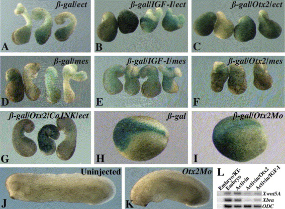 Fig. 8. IGF-I and Otx2 blocks neural and mesodermal convergent extension in âKeller sandwich explantsâ. Embryos at 8-cell stage were coinjected with IGF-I or Otx2 mRNA with Lac Z mRNA in the animal pole region or equatorial region of the two dorso-animal blastomeres. âKeller sandwich explantsâ were made at early gastrula stage and cultured to late neurula stage. (AâC) Both IGF-I and Otx2 strongly block convergent extension of neuroectoderm and mesoderm when targeted to the neuroectoderm. (DâF) IGF-I and Otx2 inhibit convergent extension of neuroectoderm and mesoderm to a lesser extent when targeted to the mesoderm. (G) Rescue of Otx2-inhibited convergent extension of neuroectoderm by caJNK1. (H) A stage 15 control embryo injected with Lac Z mRNA alone. Ã-gal-stained cells are limited to the anterior neural fold. (I) A stage 15 embryo co-injected with Lac Z mRNA and Otx2Mo. Ã-gal-stained cells extend more ventrally. (J) A stage 30 control embryo. (K) A stage 30 embryo injected with Otx2Mo shows anterior deficiency. (L) RT-PCR analysis shows the inhibition of Xwnt5A expression by IGF-I and Otx2 in activin-treated explants at neurula stage.