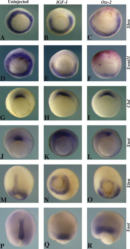 Fig. 2. IGF-I and Otx2 specifically block expression of Xbra and Xwnt-11 in vivo. Embryos at 4-cell stage were injected with synthetic mRNAs corresponding to IGF-I and Otx2 in the two dorsal blastomeres near the equatorial region. They were cultured to early gastrula (AâL) or late gastrula (MâR) stage for whole-mount in situ hybridization. (A) Xbra is expressed in the entire marginal zone mesoderm in the control embryo. (B) Dorsal injection of IGF-I blocked Xbra expression near injection sites. (C) Dorsal overexpression of Otx2 also blocked Xbra expression. Coinjection with Lac Z mRNA (red-stained cells) shows cell autonomous inhibtion of Xbra expression. (D) Xwnt-11 is expressed in the entire marginal zone in a control early gastrula. (E) Dorsal injection of IGF-I blocks Xwnt-11 expression. (F) Overexpression of Otx2 also blocked Xwnt-11 expression (red staining indicates cells coinjected with Lac Z and Otx2 mRNAs). (GâL) Dorsal injection of IGF-I or Otx2 had no effect on chordin (GâI) and Xnot (JâL) expression. (MâO) At late gastrula stage, the notochordal expression of Xbra was blocked by overexpression of IGF-I and Otx2. (PâR) Overexpression of IGF-I and Otx2 does not block Xnot expression at late gastrula stage, but prevents elongation of notochord and results in delayed gastrulation.