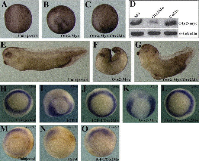 Fig. 5. Antisense Otx2 morpholino oligonucleotide rescues convergent extension and Xbra expression blocked by IGF-I and Otx2. Embryos at 4-cell stage were dorsaly-injected with IGF-I or Otx2-Myc mRNA alone or co-injected with Otx2 morpholino. They were either allowed to develop to various stages for phenotypes or fixed at stage 10.5 for in situ hybridization. (A) An uninjected embryo at stage 14 showing correct neural plate formation. (B) An Otx2-Myc-injected embryo with gastrulation defect and open blastopore. (C) Otx2 morpholino rescues blastopore closure and neural plate formation in Otx2-Myc-injected embryo. (D) Western blot showing that Otx2 morpholino specifically blocks translation of Otx2-Myc mRNA. (E) A control embryo at stage 38. (F) An Otx2-Myc-injected embryo at equivalent stage with dorsal development defect and shortened trunk and posterior region. (G) Otx2 morpholino rescues trunk and posterior development. (HâL) Otx2 morpholino rescues Xbra and Xwnt11 expression. (H) An uninjected stage 10.5 gastrula showing Xbra expression. (I) An IGF-I-injected early gastrula with absence of Xbra expression at injected site. (J) Rescue of Xbra expression by Otx2 morpholino in IGF-I-injected early gastrula. (K) An Otx2-Myc-injected early gastrula with a gap in Xbra expression in the marginal zone. (L) Rescue by Otx2 morpholino of Xbra expression. (M) An uninjected early gastrula showing Xwnt11 expression. (N) Dorsal injection of IGF-I mRNA inhibits Xwnt11 expression. (O) Rescue by Otx2 morpholino of Xwnt11 expression.