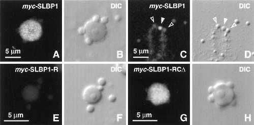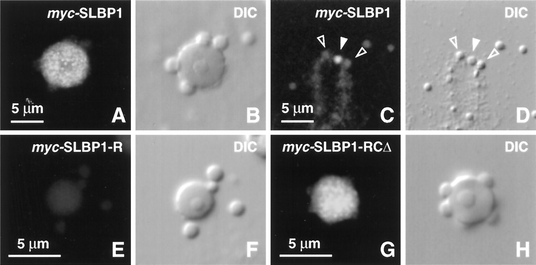 Fig. 6. Localization of myc plus NLS–tagged SLBP1 in GV spreads. Each pair of panels shows a DIC image and the corresponding immunofluorescent image after staining with mAb 9E10 against the c-myc tag. (A and B) A single coiled body from an oocyte injected 8 h previously with transcripts of full-length myc-SLBP1. The tagged protein accumulates in the matrix of the coiled body in a distinctly granular pattern. (C and D) End of a chromosome 8 h after a similar injection. The solid arrowhead points to a stained terminal granule; the open arrowheads point to two adjacent unstained B-snurposomes. (E and F) A single coiled body and three B-snurposomes 8 h after injection of transcripts of myc-SLBP1-R, which consists of the RNA-binding domain alone. Staining is at background level. (G and H) A single coiled body 8 h after injection of transcripts ofmyc-SLBP1-RCΔ. This protein accumulates in the matrix of the coiled body despite lacking a functional RNA-binding domain.