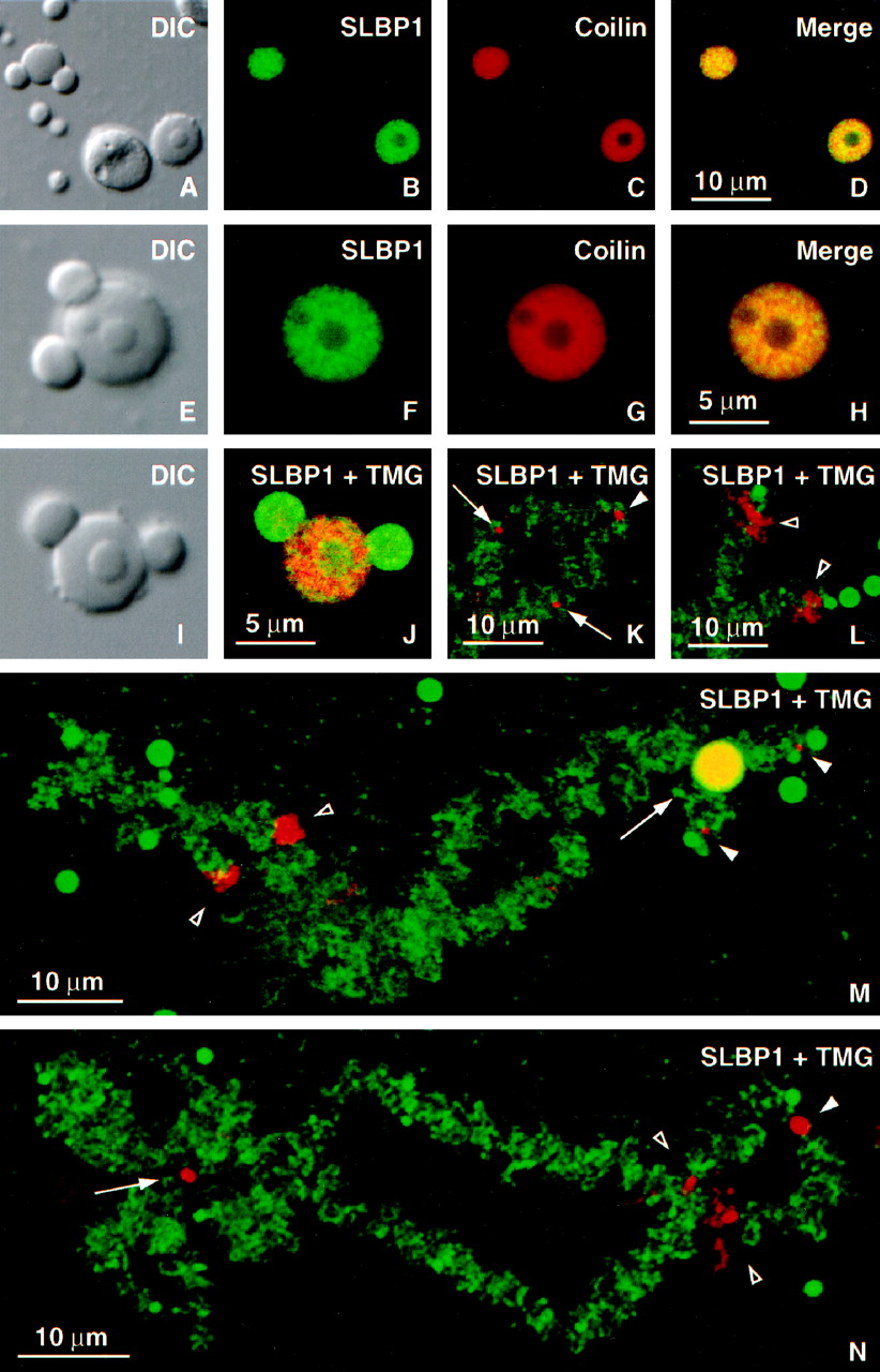 Fig. 2. Localization of SLBP1 in theXenopus GV by immunofluorescence. Stained images were taken with a Leica (Heidelberg, Germany) TCS NT confocal microscope. (A–D) DIC and immunofluorescence images of two coiled bodies, a nucleolus, and several B-snurposomes double-stained with serum X16C against SLBP1 (fluorescein) and mAb H1 againstXenopus coilin (Cy3). SLBP1 and coilin are both limited to the matrix of the coiled body, being excluded from the B-snurposomes on the surface (left coiled body) and the internal B-like inclusion (right coiled body). (E–H) Higher magnification of a similar coiled body that has two B-snurposomes on the surface and two inclusions. Note the patchy distribution of SLBP1 staining and the lack of complete correspondence between the SLBP1 and coilin stains in the merged image. (I and J) Coiled body double-stained with serum X16C for SLBP1 (Cy3) and mAb K121 for the TMG cap of snRNAs (fluorescein). mAb K121 detects U7 snRNA in the matrix of the coiled body (Bellini and Gall, 1998) and splicing snRNAs in the B-snurposomes and inclusions (Wu et al., 1991). (K–N) Lampbrush chromosomes double-stained with serum X16C for SLBP1 (Cy3) and mAb K121 for TMG (fluorescein). The nascent transcripts on almost all chromosome loops are associated with splicing snRNAs and hence stain strongly for TMG. Those few loops that stain red with serum X16C do not stain with mAb K121, presumably because they lack splicing snRNAs (open arrowheads in L–N). Terminal granules stain only with X16C (filled arrowheads in K, M, and N); the same is true of axial granules (arrows in K and N). M shows chromosome 9, which has a coiled body attached at the histone gene locus (arrow). In this case the single coiled body joins the two homologous chromosomes; in other cases each homologue may have its own coiled body. The coiled body is yellow, because it stains with both antibodies.