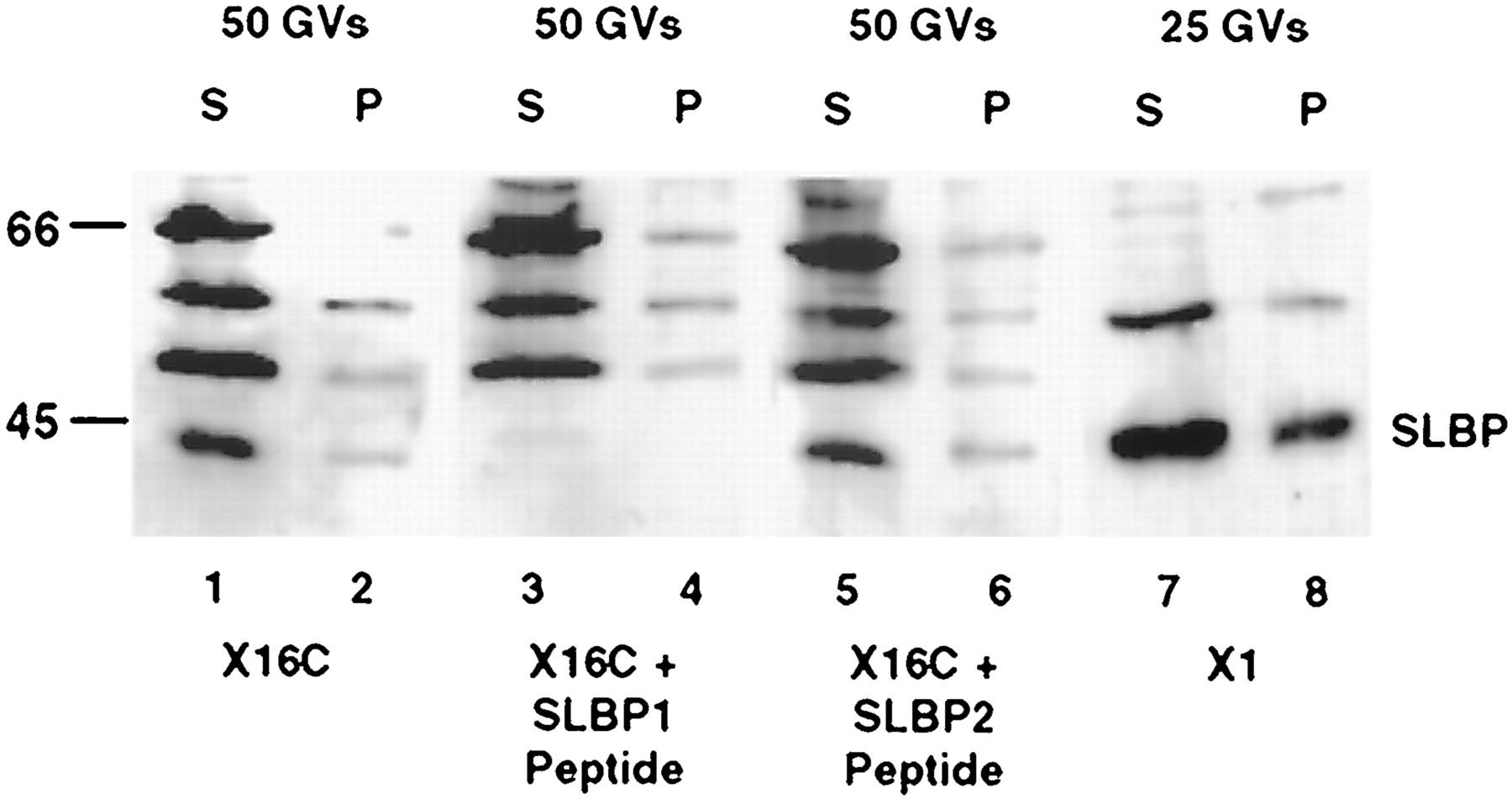 Fig. 4. Western blot of GV proteins probed with antibodies against Xenopus SLBP1. GV contents were centrifuged to separate the soluble nucleoplasm (S) from the pellet (P), which contains chromosomes, nucleoli, B-snurposomes, and coiled bodies. (Lanes 1 and 2) Proteins from 50 GVs probed with antibody X16C. (Lanes 3 and 4) Proteins from 50 GVs probed with X16C in the presence of peptide-1, against which the antibody was raised. A single band with a mobility corresponding to SLBP1 (∼40 kDa) is specifically competed. (Lanes 5 and 6) Proteins from 50 GVs probed with X16C in the presence of the unrelated peptide-2. (Lanes 7 and 8) Proteins from 25 GVs probed with antibody X1, which is more specific for SLBP1 on Western blots but gives poor immunofluorescent staining. Molecular weight standards are on the left.